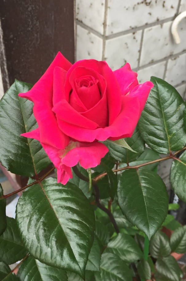 バラおかげさまで咲きましたー(*’▽’*)新鮮な葉が虫に狙われているので花が終わったらまた塀の上に置かれることになります。